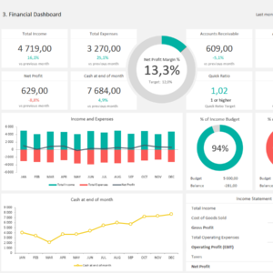 The Financial KPI Dashboard Template is an Excel template to help you track key performance indicators more effectively. This template is robust; 3 dashboards and up to 12 customizable indicators. Keep your information organized and instantly accessible. Easily interpretable 3-color graphics stand out in professional presentations and makes reporting less complicated.