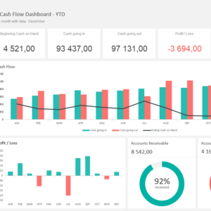 The Adnia Solutions Cash Flow Dashboard Template helps you to monitor the financial health of your business using seven key indicators. Visualize your monthly cash flow situation instantly with this specially designed Dashboard. Seeing a year at a time, so you can spot trends and compare with your current assets.