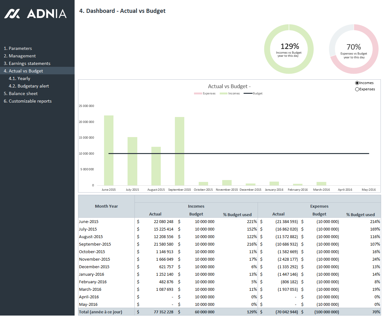 - Ease of use – Finance 360 has also been designed to simulate a web application. The tool contains a side menu to navigate between pages, as well as a settings page and a control page to facilitate the consolidation of accounts and to organize your information.