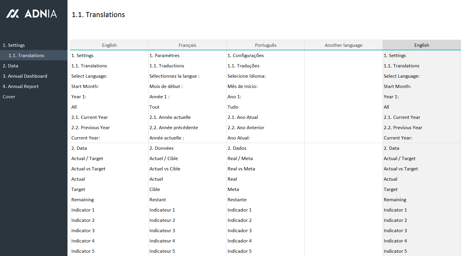 - Multilingual template: Select one of the available languages (English, French, or Portuguese) or manually translate to the language of your choice