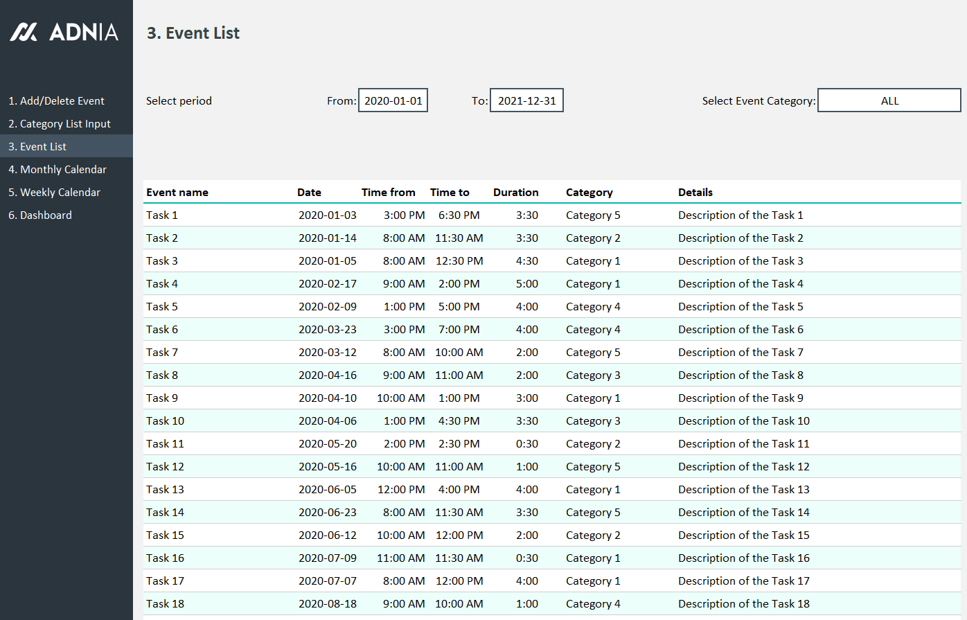 The Automated Schedule Template is a tool designed to help organise and track tasks, weather they are related to a specific purpose, such as allocating time and resources to clients, or for an overall organisational need. The event list and Dashboard are analysis features that makes this tool more than a simple calendar, it is an excellent time management tool.