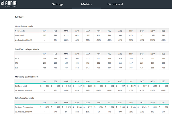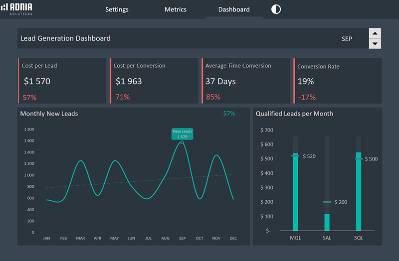 Take control of your marketing campaigns and stay agile with the Lead Generation Dashboard template. This Adnia Excel spreadsheet solution allows monitoring of your lead lifecycles and Key Metrics including conversion rate, average time of conversion, cost per conversion, cost per lead generation, qualified leads, and monthly new leads.