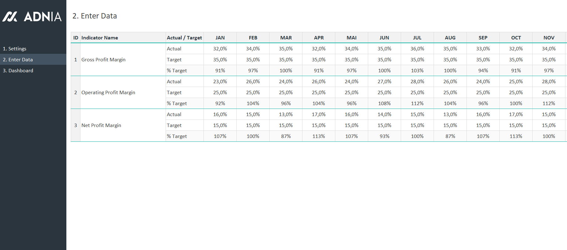 Document your accomplishments with this financial dashboard template. You can easily track 3 profit margin financial indicators on the same screen for the whole financial year. Set your indicator targets and enter your data monthly. This template is customizable, you can choose the starting month of the financial year that fits your company.