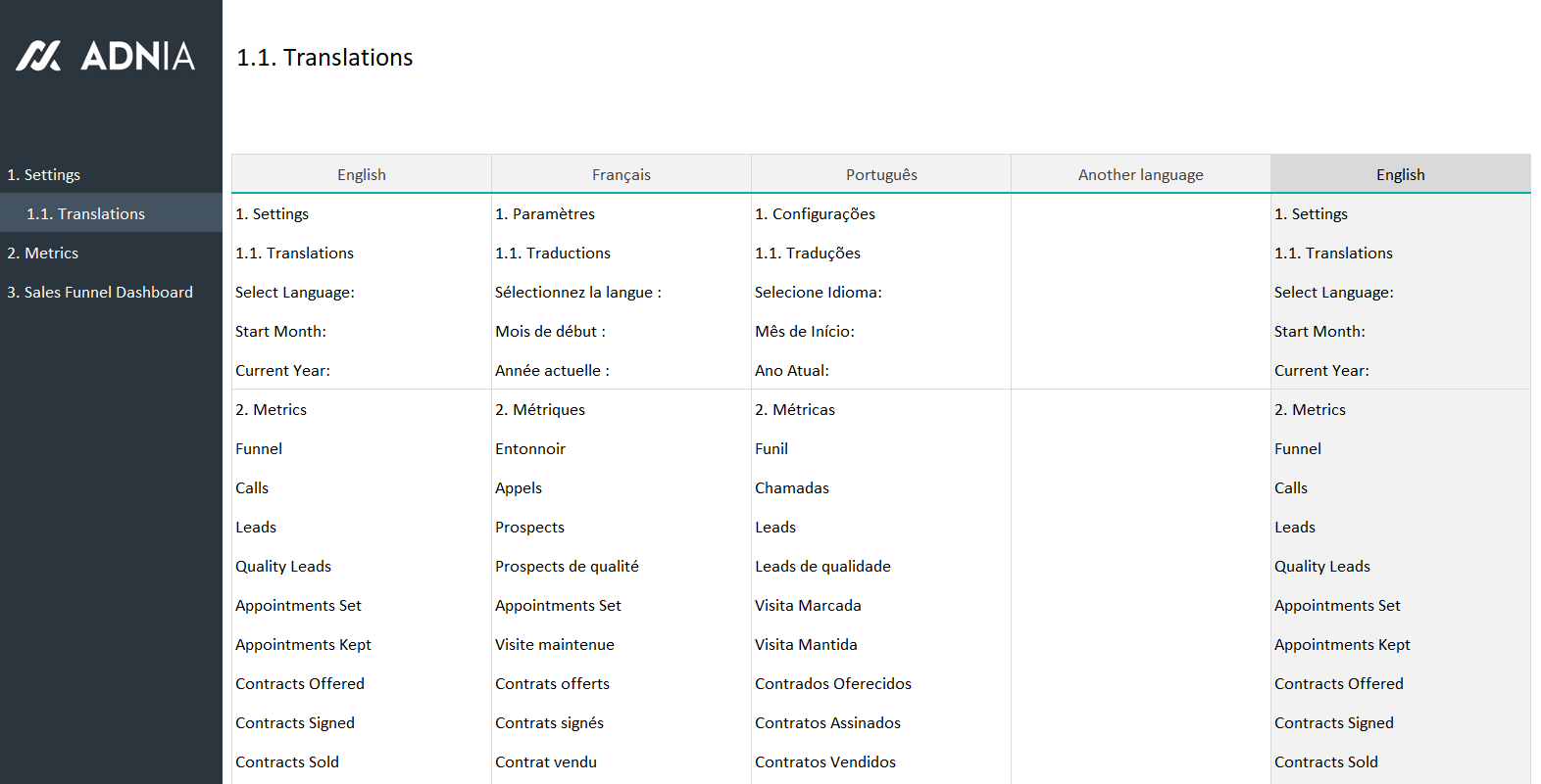 - Multilingual template: Select one of the available languages (English, French, or Portuguese) or manually translate to the language of your choice