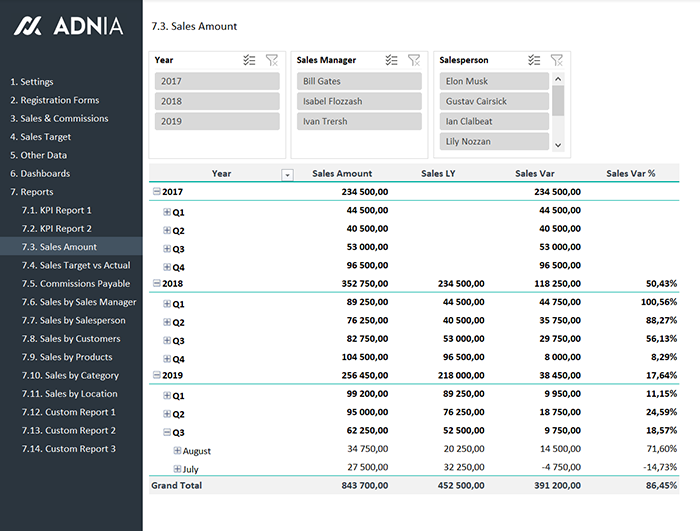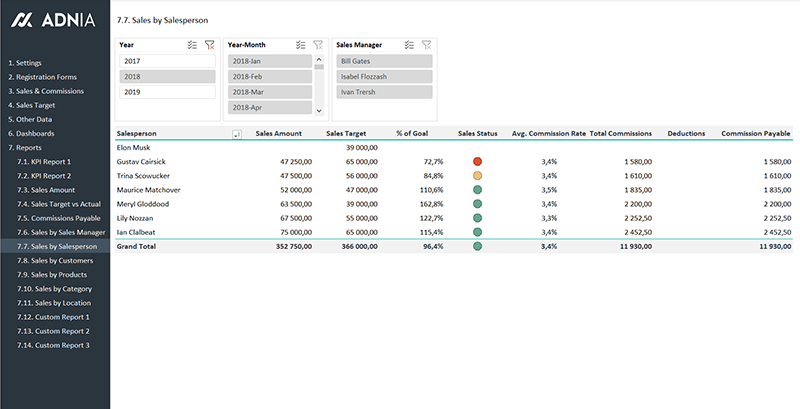 - View Sales results by customer, product, sales manager and salesperson