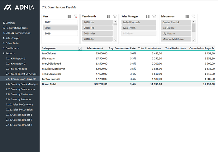 This versatile Excel template was developed using Microsoft Power BI technology (Power Query & Power Pivot) and is complete with macros to automatically update your reports. Sales KPI and Commission Tracker contains 4 dashboards and 14 ready-to-use reports with slicer options. You can also create custom reports using Pivot Table.