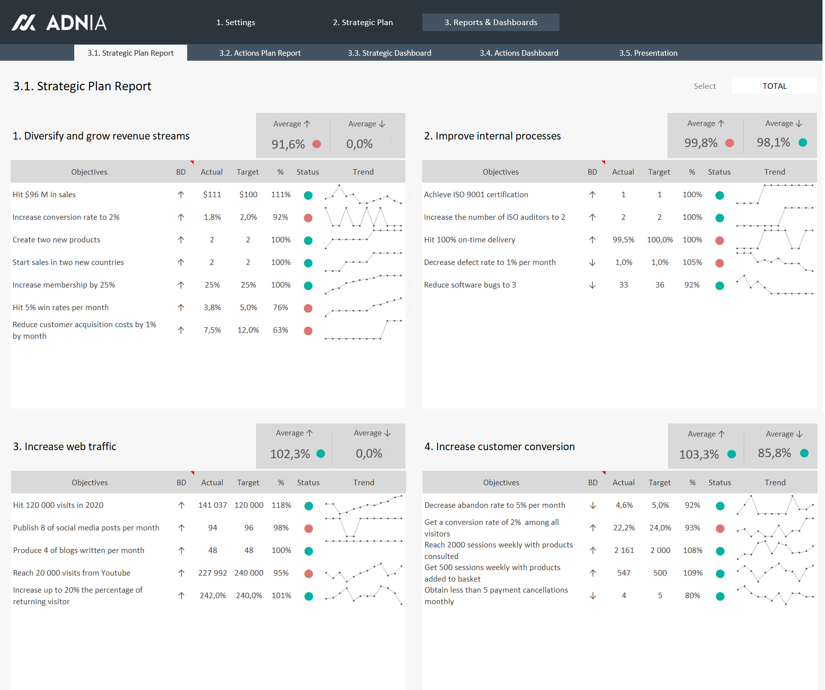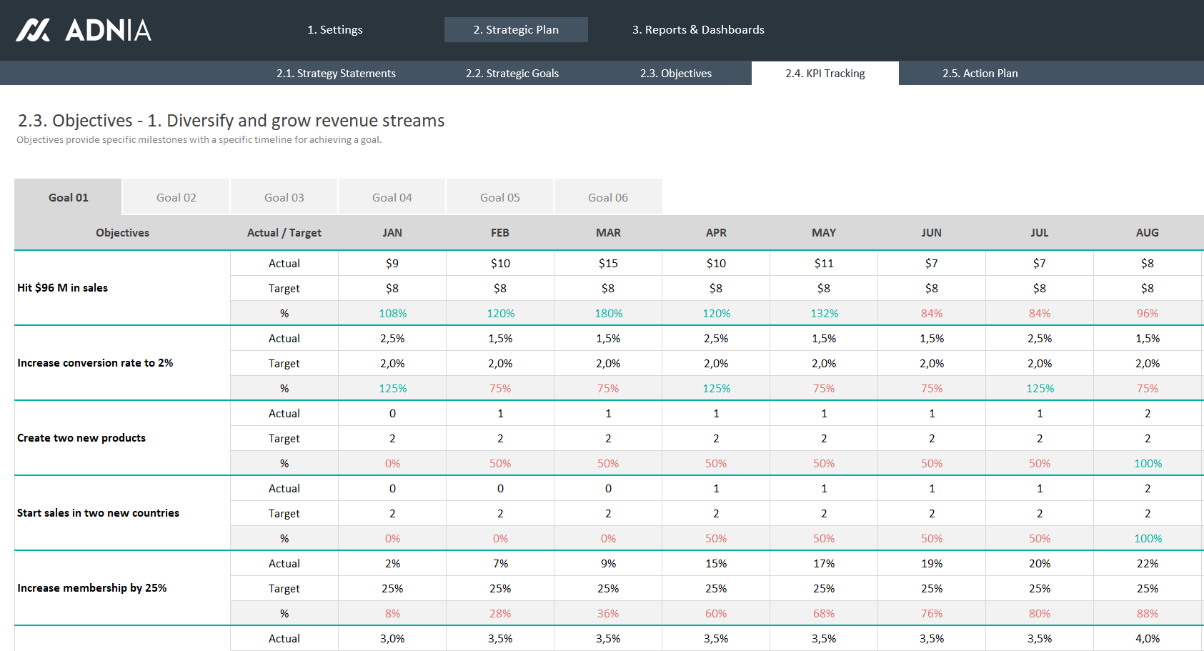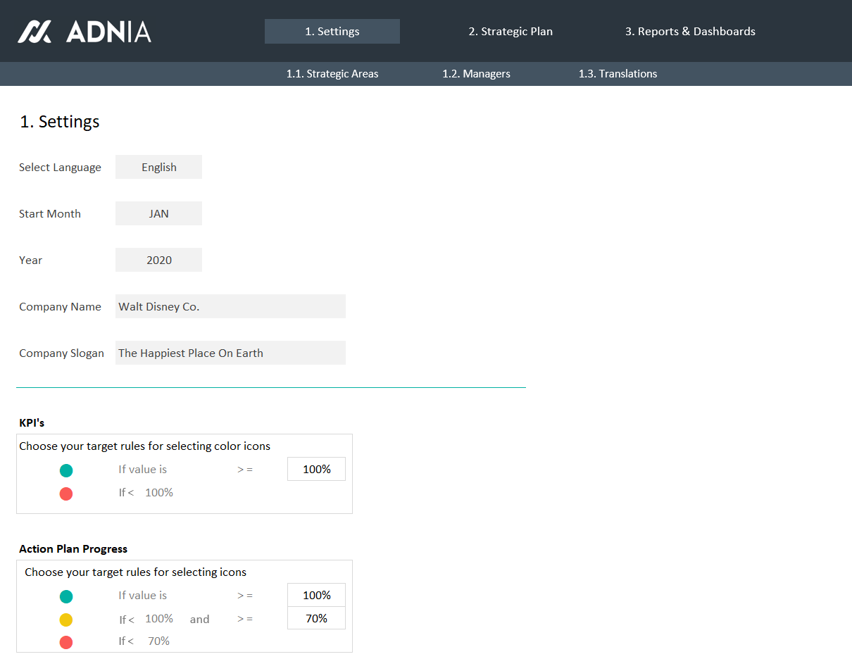 The Strategic Plan Template is an Excel Spreadsheet designed to establish and monitor the objectives and action plan that drives the performance of your organization. Use this template to drive your growth and manage risks or opportunities with key-performance indicators (KPI). The purpose of this template is to transform your strategic vision into results in all your entire company. Track your main management decisions with good data.