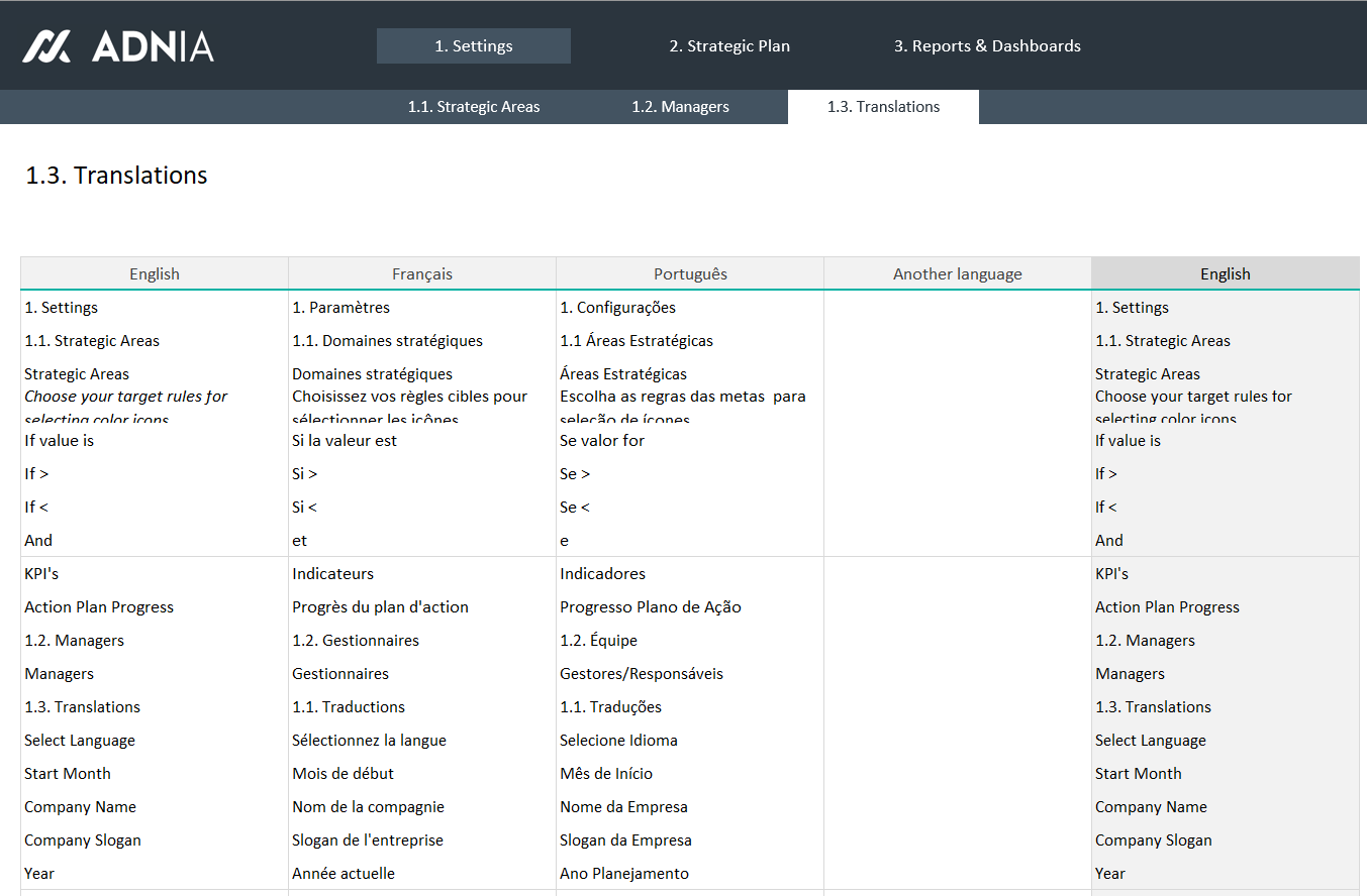 - Multilingual template: Select one of the available languages (English, French, or Portuguese) or manually translate to the language of your choice