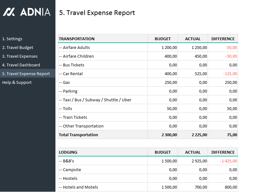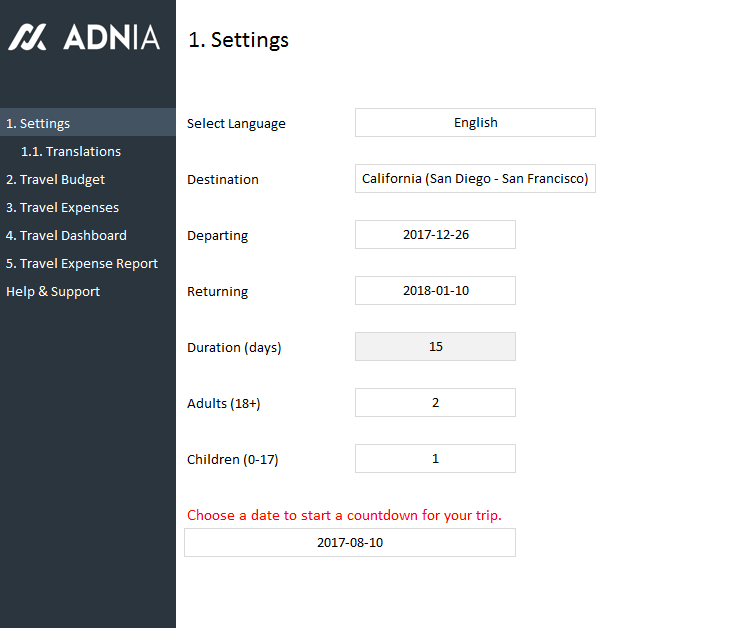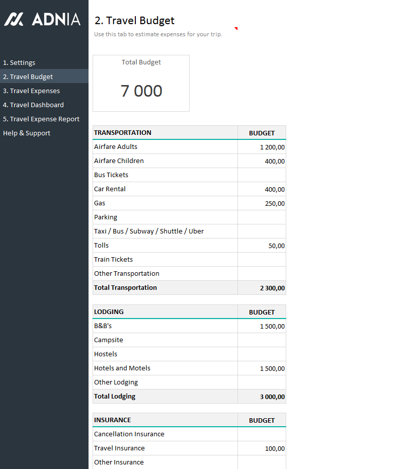 Traveling can be one of the best experiences in our lives but realizing a dream trip can be costly and inadequate planning can compromise your personal budget for several months or even years. The Adnia – Travel Budget Planning is an Excel spreadsheet designed to help you plan for that well-deserved vacation trip and avoid financial surprises.